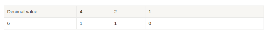 If we have before us the binary place values (1, 2, 4, 8). We know that 6 is equal to: 1 in the two column and 1 in the 4 column → 110