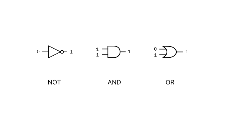 --- title: "N2T Unit One: Boolean functions and gate logic" slug: /nand-to-tetris-unit-one/ date: 2023-01-13 tags: ["article", "learning", "computer-architecture"] --- I have recently started [Nand to Tetris](https://www.nand2tetris.org/course). This course teaches the foundations of hardware and computer achitecture and is based on the textbook _The Elements of Computing Systems_ by Noam Nisan and Shimon Schocken. As the course proceeds you build a functioning general-purpose computer that is eventually capable of running Tetris and any number of other programs. The hardware is built primarily through simulation software running on Hack, a simplified [hardware description language](https://en.wikipedia.org/wiki/Hardware_description_language) similar to Verilog and VHDL. In this post I outline what I learned in the first unit. This broadly follows the curriculum but adds extra details I have acquired elsewhere to give the fullest account. ## Bits and functions The workings of a classical computer can be reduced to a series of operations on the binary digits (bits) 0 and 1. A computational process can be represented as a function: data (a series of bits) enters the function in one state and exits in another state. This new state is a product of the function. ![](./img/function-diagram-new.png) The most primitive bit operations are equivalent to the truth-conditions of the logical connectives of Boolean algebra. In logic, the Boolean values are _true_ and _false_ but we will use 1 and 0, to represent these states as bits. There are multiple logical connectives but we will mostly focus on AND, OR, and NOT for simplicity. The logic of each Boolean connective can be expressed as a function. NOT can be represented as follows; $$ f(x) = \lnot (x) $$ NOT (¬) is a unary operator which means it takes one operand (_x_). We pass a single bit as the operand and the function inverts its value. We can utilise logical [truth tables]() to represent all possible inputs and outputs for the operator: | x | f(x) = NOT(x) | | --- | ------------- | | 1 | 0 | | 0 | 1 | If NOT receives 0 as an input it will return 1 as the output. If it receives 1 as the input it will return 0 as the output. AND ($\land$) and OR($\lor$) are binary operators: they receive two operands as input. Therefore we pass two bits to the function. As a bit can be one of two values (0 or 1), there are four possible inputs. For AND this gives us: | x | y | f(x) = x AND y | | --- | --- | -------------- | | 1 | 1 | 1 | | 0 | 1 | 0 | | 1 | 0 | 0 | | 0 | 0 | 0 | AND returns 1 if both input bits are 1, otherwise it returns 0. OR returns 1 if one or both bits are 1, otherwise it returns 0: | x | y | f(x) = x OR y | | --- | --- | ------------- | | 1 | 1 | 1 | | 0 | 1 | 1 | | 1 | 0 | 1 | | 0 | 0 | 0 | ## Logic gates The logical function of each of the Boolean operators is implemented at the level of computer hardware by logic gates. Each gate is represented with one or more input pins and a single output pin through which the bits enter and exit. The pins feed into and out of a chip which executes the function. The diagram below shows the logic gates for AND, OR, and NOT. ![](./img/and-or-not-gates.png) Logic gates are an abstraction. In reality, you cannot _see_ a logic gate in a computer. If we were to look inside a chip that implements gate logic we would see an arrangement of transistors, capacitors and resistors connected by wires. These components are configured to mimic the behaviour of the logical operators. _Nand to Tetris_ starts at the level of gates and does not discuss how the individual gates are realised in electronic circuits. However, I think it is useful to understand the basics of the electrical engineering so we might begin to grasp how it is possible to go from an inert block of metal and silicon to fully functioning computer. ### The electronic implementation of gate logic We can start with the concept of a switch. Consider what is happening when we turn on a light using a wall switch. When the switch is off, the electrical circuit that connects the bulb to the voltage source is broken. As a result, there is no potential difference between the terminals and the current cannot reach the bulb. When the switch is on, the circuit is complete and the current flows freely to the bulb. This is represented by the following simple schematic: ![](./img/single-switch-and-circuit.png) This circuit embodies the logic of a NOT gate. Think of the light as 1 and the absence of light as 0. When the switch is on, 1 is the output and 0 is inverted. When the switch is off, 0 is the output and 1 is inverted. This scenario can be developed to represent the logical behaviour of an AND gate. Imagine now that this room is a bit strange and there are two switches controlling the operation of the bulb. If both switches are off the bulb will not emit light. If one of the switches is on and the other is off the bulb will not emit light. The bulb will only emit light when _both_ switches are on. The schematic for this scenario embodies the logic of the Boolean AND connective: ![](./img/double-and-circ.png) Switch-controlled circuits are functionally equivalent to what actually happens inside a computer when logical conditions are implemented via gates. Electrical charge is directed along different routes depending on the value of an on/off condition. However, in modern computers the actual component that controls the flow of current is not a switch. Whilst we could construct primitive computers with switches, the average CPU has more than a million logic gates. Controlling this number of gates with mechanical switches would be practically impossible and even if it were achieved, it would result in extremely slow processing times. This is an important point because the computational power of logic gates emerges from their behaviour at scale. Collections of gates are combined to express complex logical conditions that are a function of their individual parts