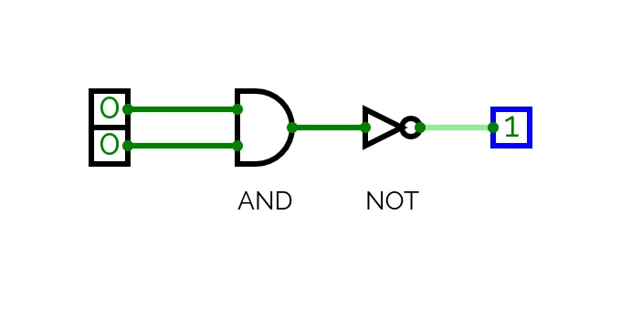 We can confirm that the circuit implementation is an accurate representation of _P_ by toggling the input values to confirm that the output is only 1 when either _x_ or _y_ is true and _z_ is false. ### Further simplification with NAND Our circuit uses three different types of logic gate. This is satisfactory but it would better if we could simplify the circuit even further and use a single gate rather than three. To do so we need to further reduce our logic and introduce another type of logic gate: NAND. NAND stands for "NOT AND" and its truth conditions are the inversion of AND: | x | y | f(x) = x NAND y | | --- | --- | --------------- | | 1 | 1 | 0 | | 0 | 1 | 1 | | 1 | 0 | 1 | | 0 | 0 | 1 | NAND returns 1 whenever _x_ and _y_ are not both true. We will represent NAND in our formulae with the symbol: $$ \tilde\land $$ NAND is a _universal logic gate_. This means that by using NAND gates and only NAND gates, we can represent the truth function of every other logic gate (AND can be expressed with just NAND gates, as can OR and so on). It follows that we can create every possible logical circuit using NAND gates alone. Let's demonstrate this by reformulating _(x OR y) AND NOT z_ with just NANDs: $$ ( [(x \tilde\land x) \tilde\land (y \tilde\land y)] \tilde\land (z \tilde\land z) ) \tilde\land ( [(x \tilde\land x) \tilde\land (y \tilde\land y)] \tilde\land (z \tilde\land z) ) $$ This is quite difficult to parse, so let's look at the circuit representation and derive its equivalence to _(x OR y) AND NOT z_: You will notice that there is repeated forking pattern to most of the inputs. This occurs when the same input value is used for both input pins, equivalent to _x NAND x_ in the equation: ![](./img/nand-fork.png) When a NAND is wired to receive the same value for each input, it embodies the truth conditions for NOT: in the diagram above when _a_ is 1 the output is 0 and when _a_ is 0 the output is 1. If we feed two of these sub-circuits into a NAND, we observe that the output is consistent with the truth conditions for OR: