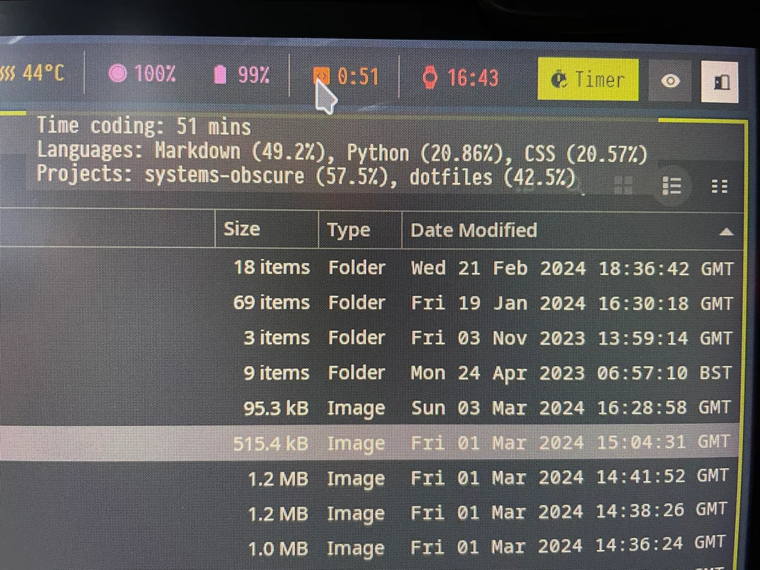 A key component is a useful status bar that displays metrics and provides a means of quickly executing common tasks. Previously, when I was using X, I opted for Polybar but now that I am on Wayland I'm using waybar. So far, I've added two custom modules: one for displaying code metrics and another for managing my time-tracking.