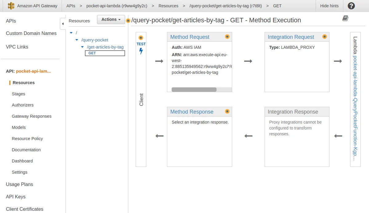 • I have a single endpoint: /query-pocket/get-articles-by-tag. I have given it it's own path rather than just using the root /query-pocket because I may add additional endpoints in the future